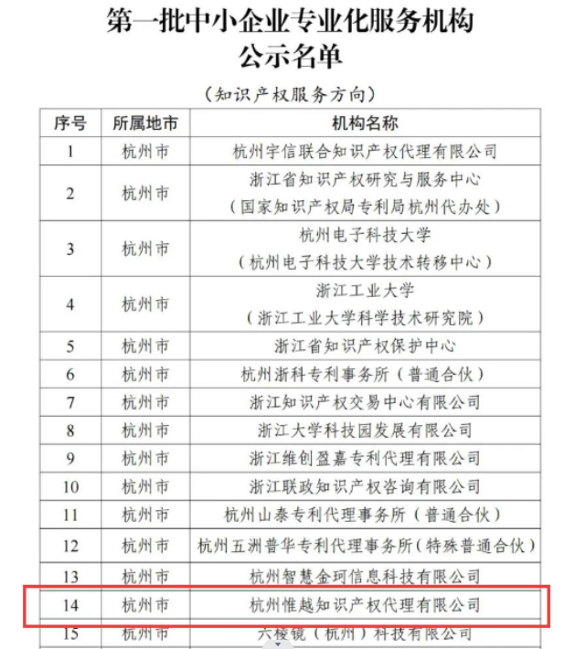 喜報?。£P(guān)于杭州惟越知識產(chǎn)權(quán)代理有限公司入選浙江省首批中小企業(yè)專業(yè)化服務(wù)機構(gòu)的公示
